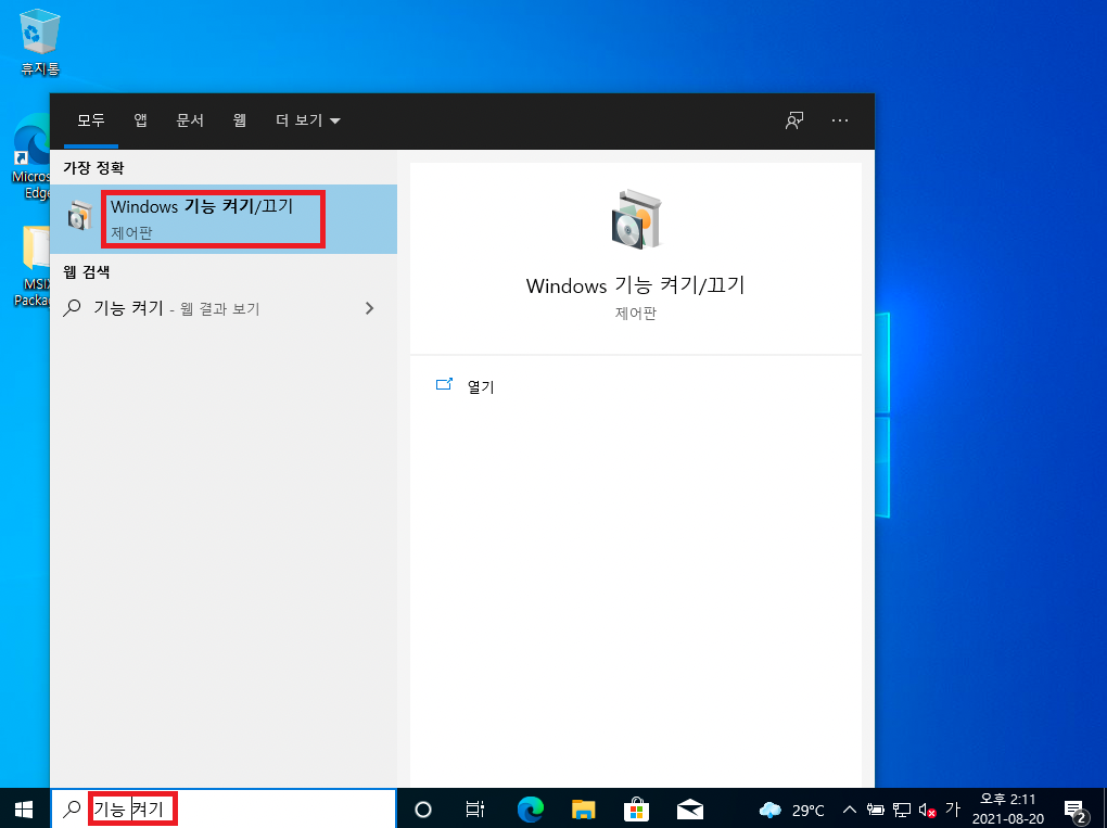 시작 -> 기능 켜기로 검색 -> Windows 기능 켜기 / 끄기를 실행한다.