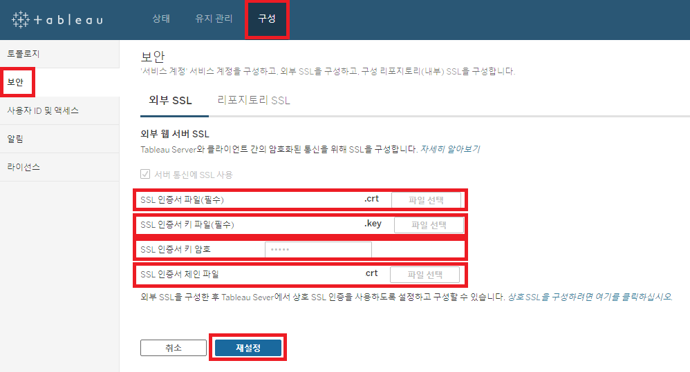 상단 네이게이션바에서 "구성" -> "보안" -> "외부 SSL"로 이동한다.