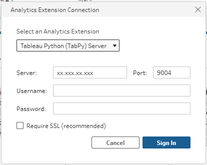 | 필요한것 : 1) 우선 tabpy 서버가 활성화 되있어야 한다. |